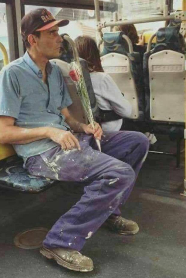 Omul venea cel mai probabil de la muncă. Era vizibil epuizat, avea o ținută care arăta că muncise din greu toată ziua pe șantier. Dar nu asta a atras atenția persoanelor din jur, ci obiectul pe care îl ținea în mână: un trandafir roșu.
