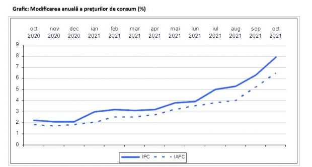 Inflaţia în octombrie 2021, comparativ cu octombrie 2020, a ajuns la 7,9%, faţă de 6,3% în septembrie.