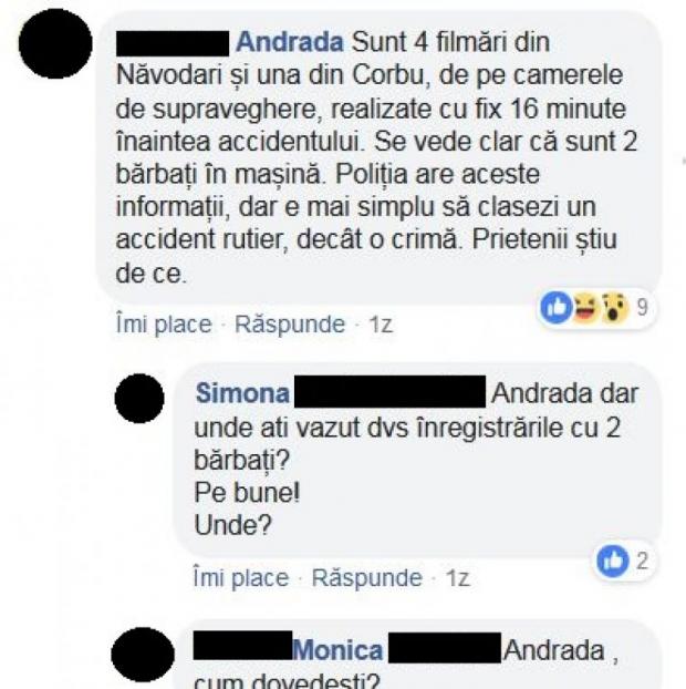 ”Sunt 4 filmări din Năvodari și una din Corbu, de pe camerele de supraveghere, realizate cu fix 16 minute înainte accidentului. Se vede clar că sunt 2 bărbați în mașină. Poliția are aceste informații, dar e mai simplu să clasezi un accident rutier, decât o crimă. Prietenii știu de ce”, spune femeia într-o postare care a fost eliminată de pe pagina designerului la câteva ore după ce a fost scrisă.