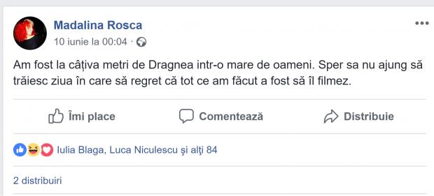 Astfel, a doua zi după marele miting pesedist din Piața Victoriei, Mădălina Roșca relatează pe Facebook: