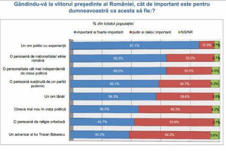 87,1% dintre români vor drept președinte un om politic cu experiență și 65,3% consideră important ca viitorul președinte să fie de naționalitate română. 65,2% ar opta pentru o persoană care să fie cât mai independentă de clasa politică iar 60,1% dintre români cred că e important ca președintele să fie susținut de un partid puternic. 58,3% dintre respondenți ar vrea un președinte tânăr, 46,5% optând pentru cineva mai nou în viața politică. 43,7% consideră că este important ca viitorul președintele să fie de religie ortodoxă și 40,2% cred că e important ca viitorul președinte să fie un adversar al lui Traian Băsescu.