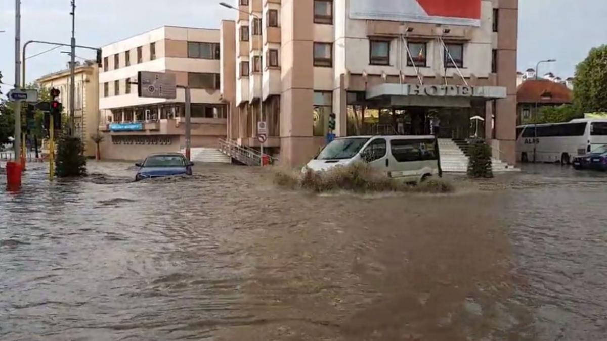 Inundaţii apocaliptice la Tulcea, sâmbătă seara. După un sfert de oră de potop, apa de pe străzi a luat pe sus maşinile.