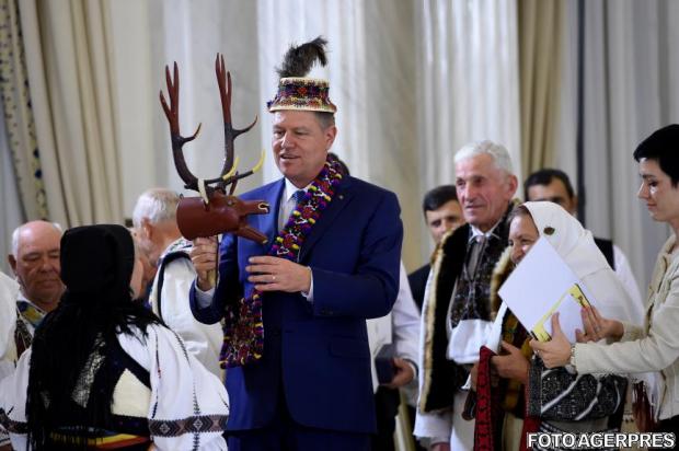 Preşedintele a schimbat câteva cuvinte cu fiecare dintre cei 26 de artişti şi meşteşugari cărora le-a oferit medalia La finalul evenimentului, Klaus Iohannis i-a invitat pe medialiaţi să facă o poză de grup, aceştia oferindu-i mai multe obiecte tradiţionale, printre care un clop, pe care preşedintele şi l-a pus în cap, dar şi ştergare, fulare, precum şi un cap de cerb pentru colindat. Preşedintele a luat aceste obiecte, le-a purtat râzând şi s-a pozat cu artiştii prezenţi.