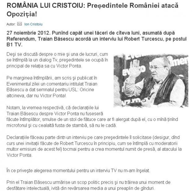 "Joi, 14 februarie 2013, Traian Băsescu a acordat un interviu definit prin aceleaşi note ca şi cel din 27 noiembrie 2012. Şi când spun asta iau în considerare nu atât faptul că l-a acordat tot lui Robert Turcescu şi tot postului B1 TV, cât faptul că, deşi au fost abordate o mie şi una de chestiuni, esenţa dialogului l-a constituit motivul pentru care Traian Băsescu s-a cerut la un interviu: spectaculoasa atacare a PDL. Altfel zis, Traian Băsescu şi-a programat acest interviu pentru a lansa cel mai dur atac asumat în cei opt ani de mandat împotriva unui partid de pe eşichierul politic al ţării", scrie Ion Cristoiu.