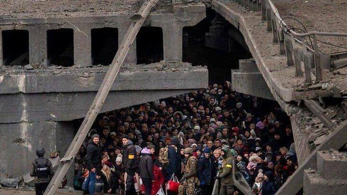 Foto (principală și galerie): civili adăpostindu-se de loviturile aviației ruse sub un pod avariat din Irpin, civili în timp ce încearcă să părăsească localitatea și blindate rusești în oraș