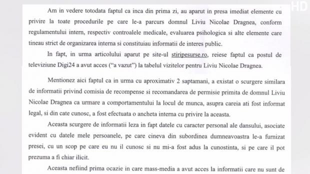Este vorba de o notificare prezentată în exclusivitate la Antena 3, semnată de Irina Tănase, în care cere conducerii Penitenciarului Rahova să descopere cum a fost posibilă scurgerea de informații către presă.