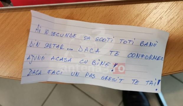”Ai 10 secunde să scoți toți banii din sertar...Dacă te conformezi ajungi acasă cu bine! Dacă faci un pas greșit te tai”, este mesajul primit de casieră.