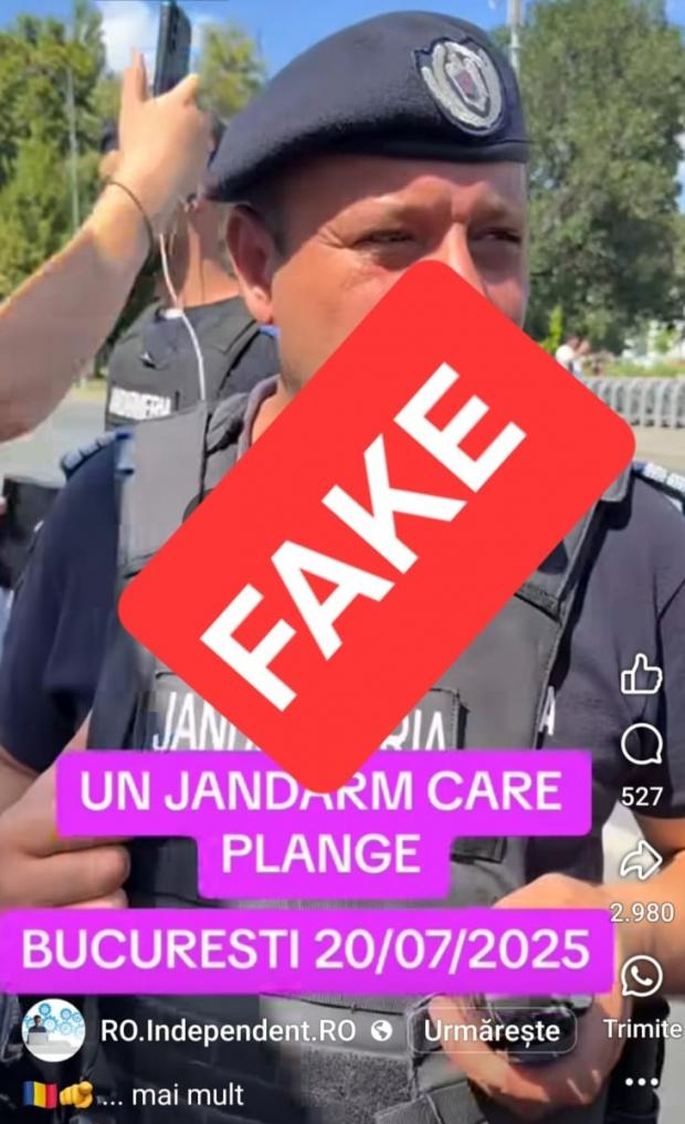 Oficialii Jandarmeriei Capitalei au denunțat, duminică seara, un fake news despre o poză falsificată care creează impresia că un jandarm calcă, în mod voit, în picioare steagul României. La scurt timp după ce a apărut în mediul online, fotografia a devenit virală şi a stârnit numeroase reacţii negative. Imaginea a fost extrasă dintr-o filmare în care se vede că jandarmul calcă, din greşeală, drapelul, în timpul unei busculade care a avut loc duminică la protestul organizat în Piața Victoriei.