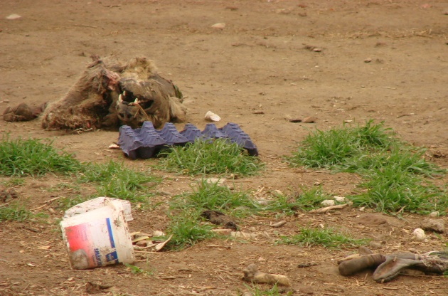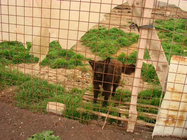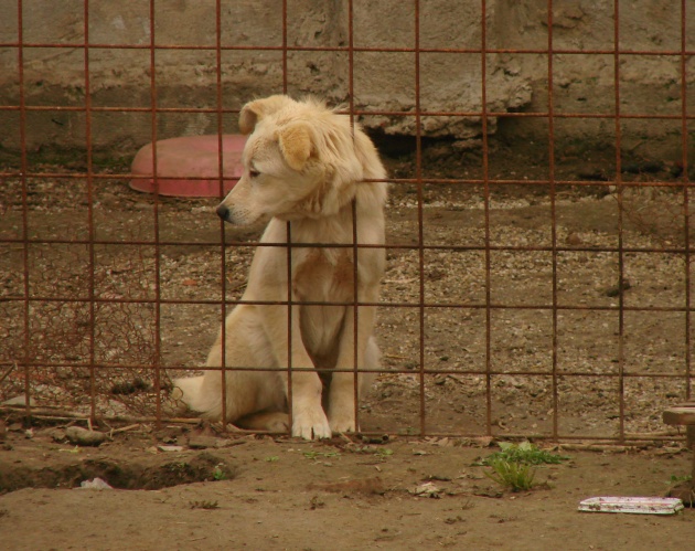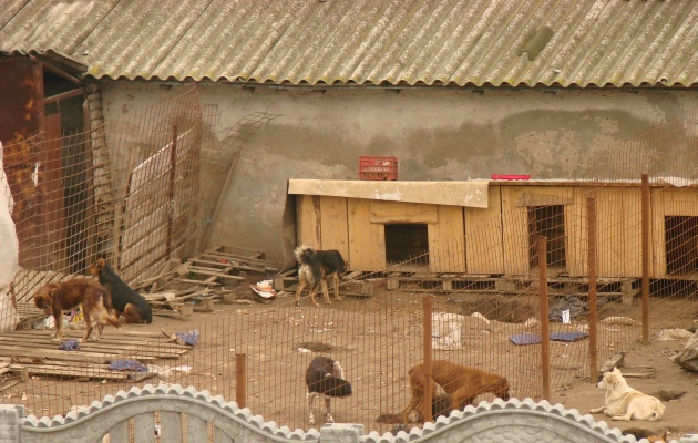 Tot în ţarc, un cadavru de câine, pe alocuri muşcat, stăpâneşte terenul, alături de o găleată de construcţii şi un cofraj de ouă, lăsate de izbelişte în curtea adăpostului.