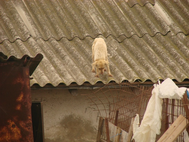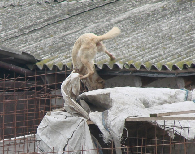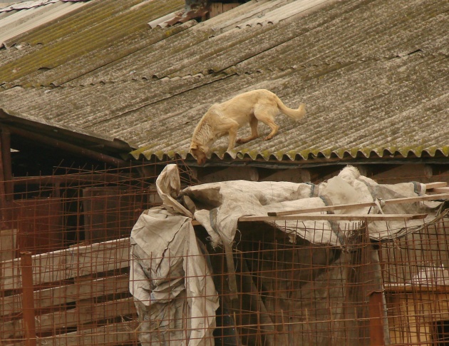 Un alt câine a scăpat din captivitate, s-a căţărat pe acoperişul din tablă al adăpostului şi bântuia în căutare de hrană.