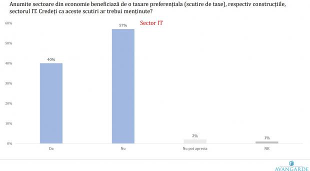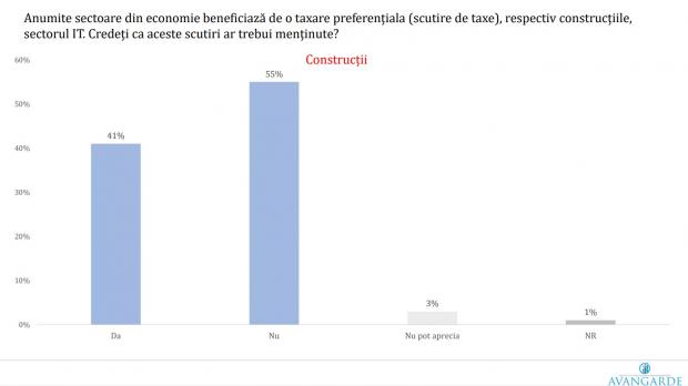 Astfel, întrebați dacă taxarea preferențială (scutirea de taxe) ar trebui menținută pentru anumite sectoare din economie, respectiv construcțiile şi sectorul IT respondenții au spus: