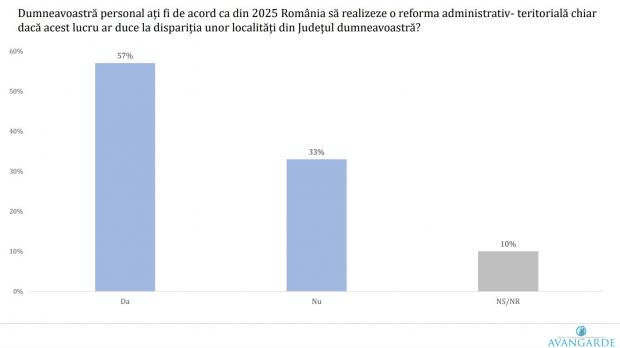 Întrebați apoi dacă ar fi de acord ca în 2025 România să realizeze o reformă administrativ-teritorială, chiar dacă acest lucru ar duce la dispariția unor localități din judeţul de domiciliu?