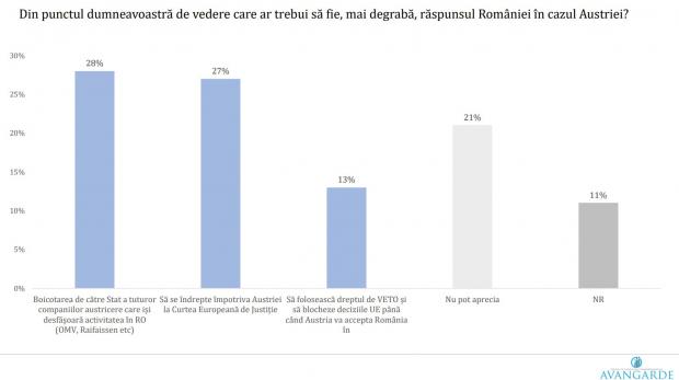 - 28% susţin boicotarea de către stat a tuturor companiilor austricere care iși desfășoară activitatea în RO (OMV, Raifaissen etc)