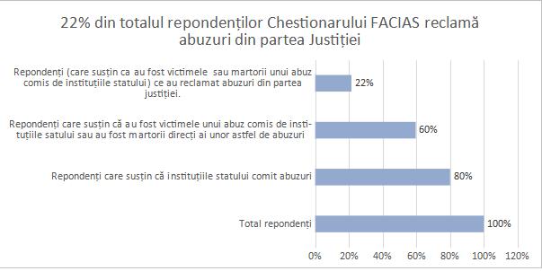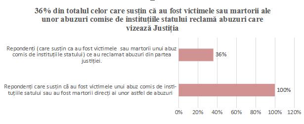 De asemenea, 80% din totalul repondenților chestionarului consideră că instituțiile statului comit abuzuri. Din totalul celor care susțin acest lucru, 36% reclamă abuzuri în sfera justiției.