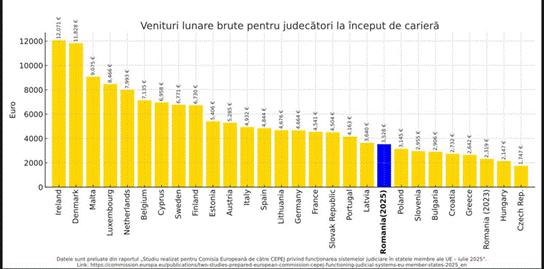 Astfel, în ceea ce priveşte venitul brut al unui judecător la început de carieră, analiza datelor comunicate de 27 de state indică faptul că România se situează pe locul 20, pe primele trei poziţii aflându-se Irlanda, Danemarca şi Malta. Venitul brut/lună în România este similar celui din Lituania.