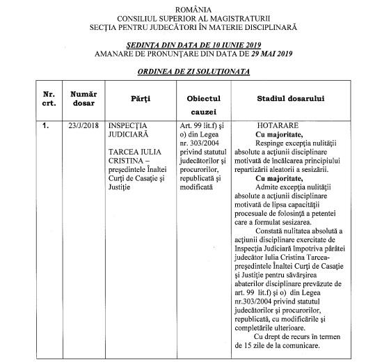 Secția de judecători a CSM a respins luni, cu majoritatea de voturi, acțiunea începută de Inspecția judiciară împotriva șefei ÎCCJ, Cristina Tarcea.