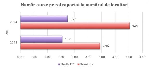 Raportat la populație, România a ajuns la 4 cauze în curs de soluționare la 100 de locuitori în 2024, peste dublul mediei europene (1,75). În 2023, coeficientul era de 2,95 la 100 de locuitori, la o medie europeană de 1,56.