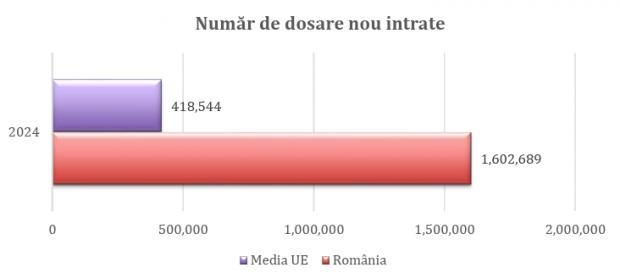 Datele indică o creștere față de 2023, când România a raportat 1.495.992 cauze nou-intrate, la o medie europeană de 407.371, iar coeficientul era de 7,85, față de media europeană de 2,18.