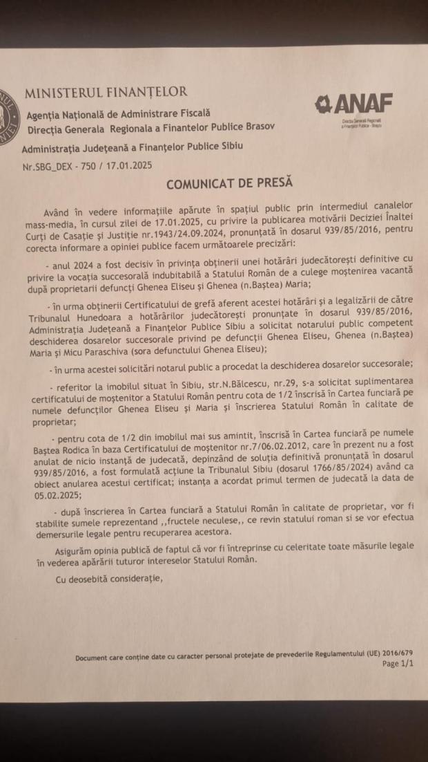 ANAF precizează că nu tot certificatul de moștenire a fost anulat și că rrebuie să mai fie anulată o cotă parte de 1/2. Abia apoi statul se va putea înscrie în cartea funciară și va putea să recupereze prejudiciul. Termenul pentru anularea acestei cote părți de 1/2 din certificatul de moștenitor a fost fixat pentru 5 februarie. Atunci urmează să fie judecată și această cotă din certificatul de moștenitor.