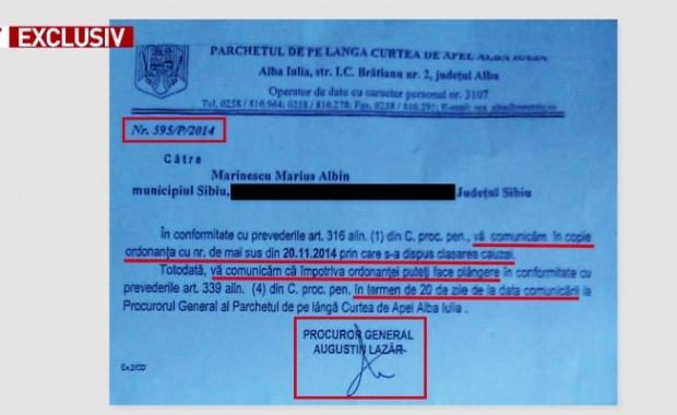 „Soluţia a fost dată de către procurorul de caz prin ordonanţă, iar ulterior soluţia a fost comunicată reclamantului printr-o adresă semnată de procurorul general al Parchetului de pe lângă Curtea de Apel Alba Iulia”, afirmă sursa citată.