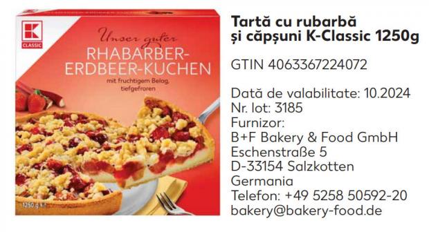 Avertismentul se referă la produsul "Tartă cu rubarbă şi căpşuni K-Classic 1250g" GTIN 4063367224072 Dată de valabilitate: 10.2024 Nr. lot: 3185 Furnizor: B+F Bakery & Food GmbH Eschenstraße 5 D-33154 Salzkotten Germania.