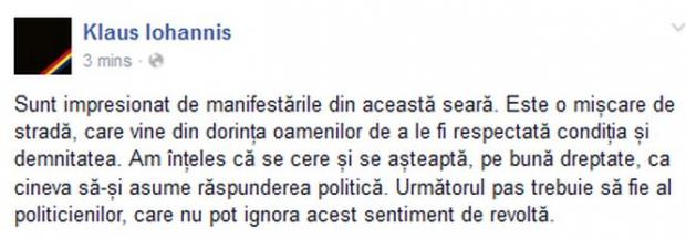 "Sunt impresionat de manifestările din această seară. Este o mișcare de stradă, care vine din dorința oamenilor de a le fi respectată condiția și demnitatea. Am înțeles că se cere și se așteaptă, pe bună dreptate, ca cineva să-și asume răspunderea politică. Următorul pas trebuie să fie al politicienilor, care nu pot ignora acest sentiment de revoltă", a scris președintele Klaus Iohannis pe Facebook.