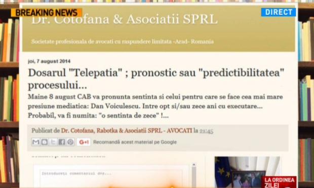 Dana Grecu a dezvăluit, în ediția de miercuri a emisiunii ”La ordinea zilei”, de la Antena 3, că soțul judecătoarei Lavinia Nicoleta Coțofană, fost ofițer SRI timp de 11 ani, care acum candidează pentru un loc în CSM, știa cu o zi înainte ce sentință va primi Dan Voiculescu, în dosarul Telepatia.