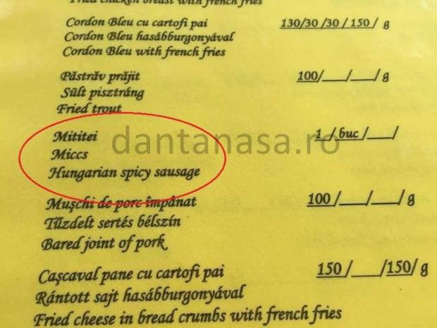 La secțiunea în engleză a meniului, proprietarii restaurantului au trecut „Hungarian spicy sausage” (cârnaț picant unguresc) în dreptul micilor.