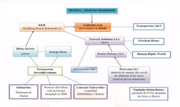 În schimb, serverul pe care este găzduit site-ul ro100.ro este deținut de compania GoDaddy.com LLC, înregistrată în Delaware (SUA). Acționarul majoritar al acestei companii este fondul de investiții Kohlberg Kravis Roberts &Co. (cunoscut și drept KKR), la care acționar majoritar este miliardarul Henry R. Kravis, potrivit sursazilei.ro.