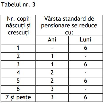 Mai mult, reducerea vârstei de pensionare se va aplica şi în cazul în care numărul de copii cuprinde şi copii adoptaţi şi crescuţi pe o perioadă de cel puţin 14 ani.