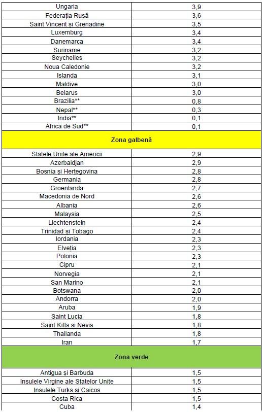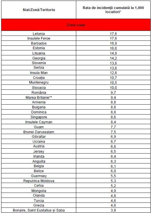 Astfel, în zona roșie au intrat Cehia, Ungaria, Danemarca, Islanda, Luxemburg, Maldive și Insulele Cayman.