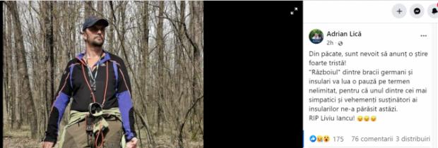 "Din păcate, sunt nevoit să anunț o știre foarte tristă! "Războiul" dintre bracii germani și insulari va lua o pauză pe termen nelimitat, pentru că unul dintre cei mai simpatici și vehemenți susținători ai insularilor ne-a părăsit astăzi. RIP Liviu Iancu!“, a scris prietenul său, Adrian Lică, informează stiridiaspora.ro