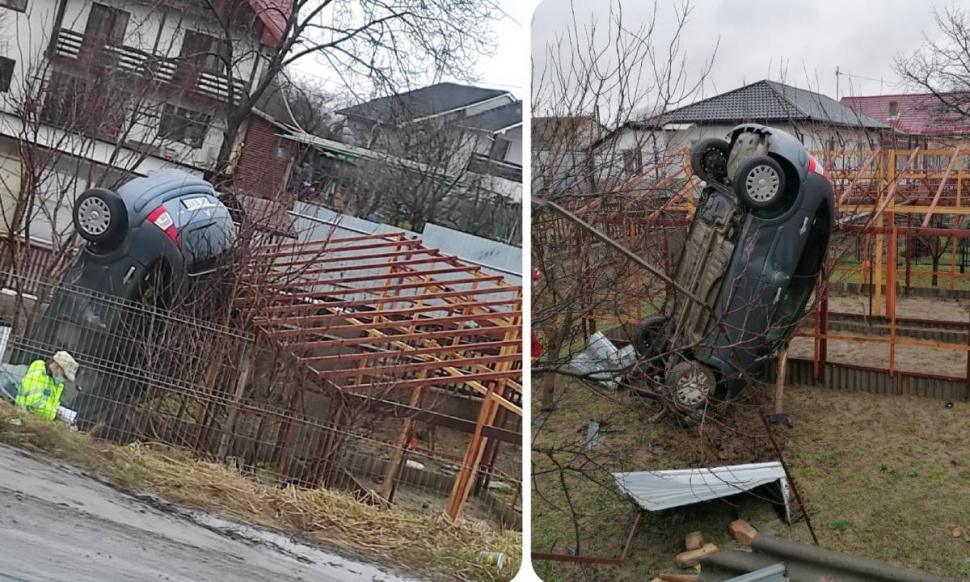Accident inedit în Bacău. Un şofer s-a răsturnat cu maşina în curtea unui localnic