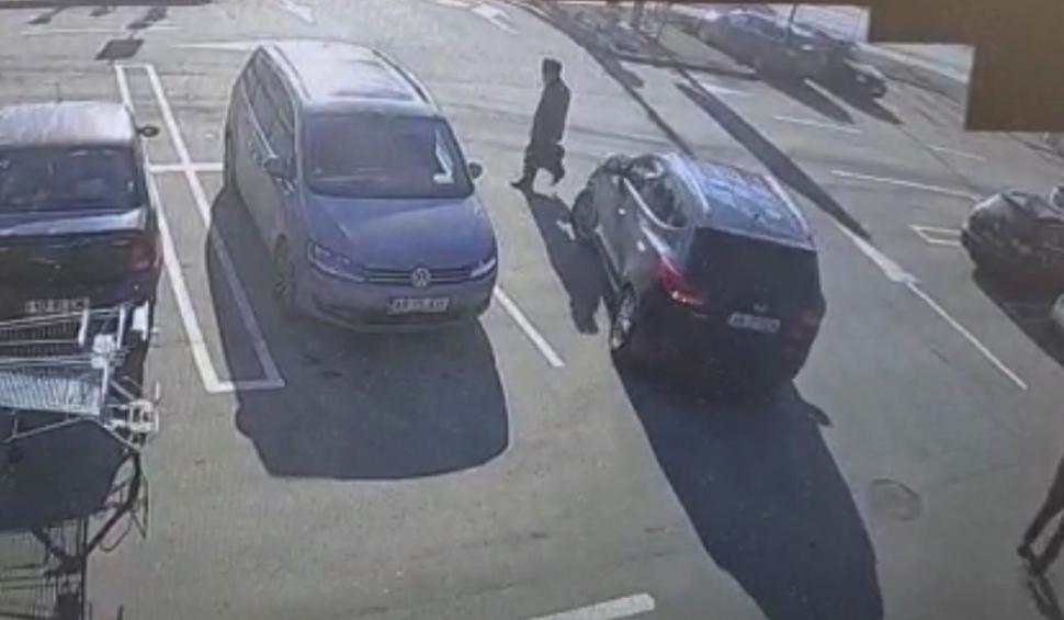 Scene teribile în parcarea unui supermarket din Alba Iulia. Un bătrân de 81 de ani a fost lovit de o maşină, iar totul a fost filmat de o cameră de supraveghere.