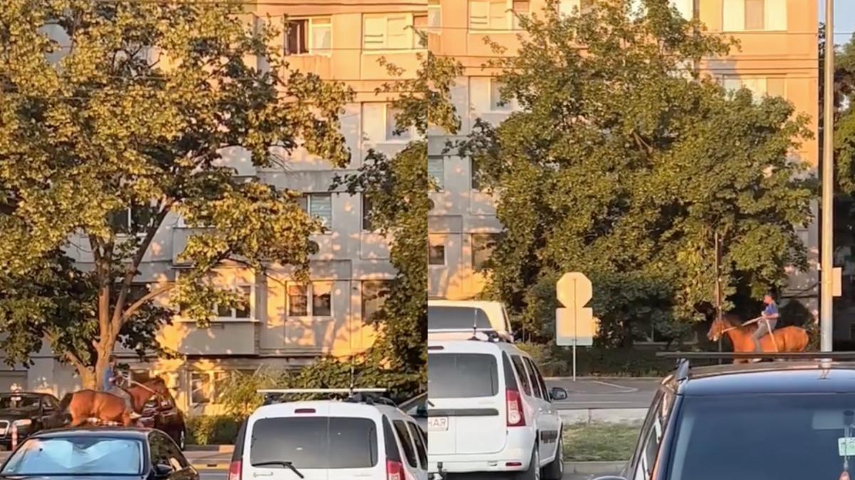 Un bărbat a fost filmat de trecători în timp ce se plimba cu calul pe o pistă de biciclete din Focșani. La un moment dat, o dubă și o autospecială de Poliție trec pe lângă el, iar acesta face cale întoarsă și o ia la trap printre blocuri. După câteva secunde, un polițist este văzut alergând după călăreț.
