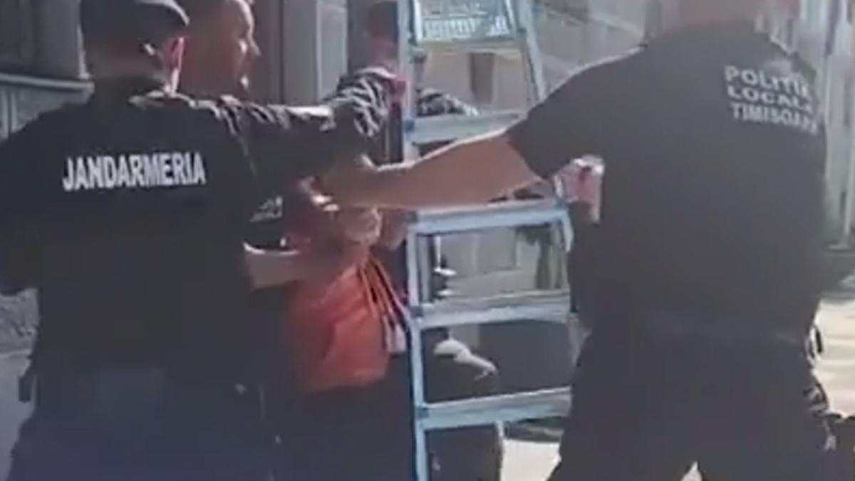 Bărbat săltat de jandarmi după ce a vrut să dea jos steagurile din faţa primăriei din Timişoara: "Toate sunt ilegale"