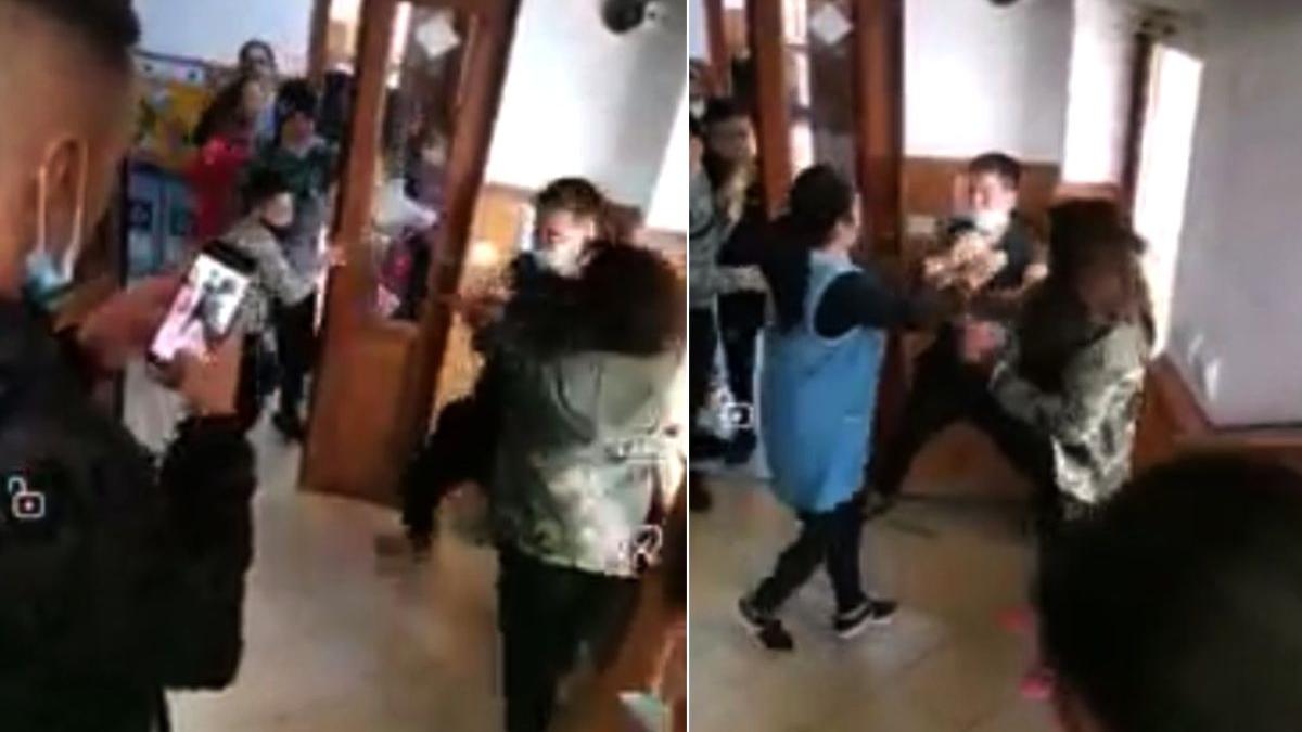 La un moment dat, o altă fată încearcă să îi despartă pe cei doi, însă este dată la o parte de un alt elev, care îi încurajează pe cei doi să se lovească în continuare. Totul se termină în momentul în care o angajată a şcolii apare în zonă şi îi desparte pe cei doi copii.
