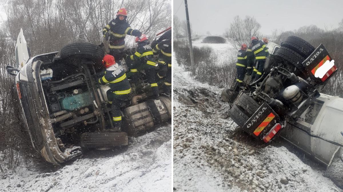 Potrivit ISU Harghita, accidentul a avut loc la intrarea în localitatea Voșlăbeni dinspre Izvoru Mureșului, unde o autocisternă încărcată cu motorină și benzină s-a răsturnat în afara părții carosabile.