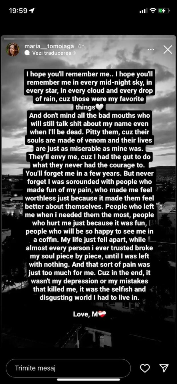 Maria Tomoioagă: "Mă vei uita în câțiva ani. Dar nu uita niciodată că am fost înconjurată de oameni care și-au bătut joc de durerea mea, care m-au făcut să mă simt lipsită de valoare"