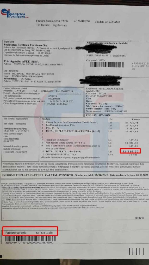În luna iulie a primit o factură, reprezentând o regularizare de patru ani, la curent electric. Citirea contorului nu s-a mai făcut din luna mai 2019, pe motivul că furnizorul "nu are cititori", iar de atunci furnizorul a calculat, la tariful actual, că familia are de plătit suma de aproape 33.000 de lei.