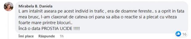 "L-am întâlnit aseară pe acest individ în trafic, era de Doamne fereşte. S-a oprit în faţa mea brusc, l-am claxonat de câteva ori până să aibă o reacţie şi a plecat cu viteză foarte mare printre blocuri. Încă o dată, prostia ucide!", a scris femeia.