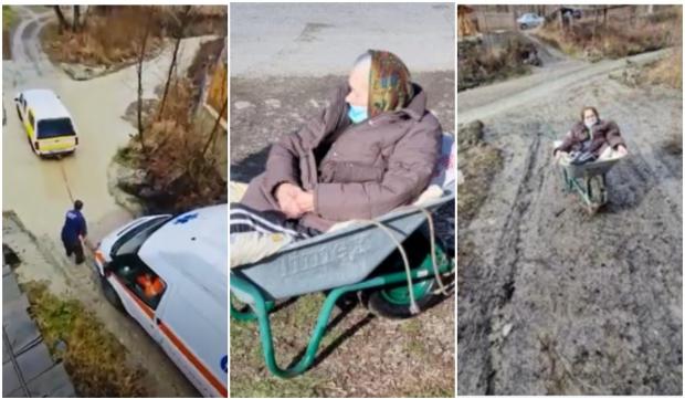 Este şi cazul unei bătrâne de 85 de ani cu un picior amputat care a fost adusă acasă cu o roabă, pentru că drumul era inundat.