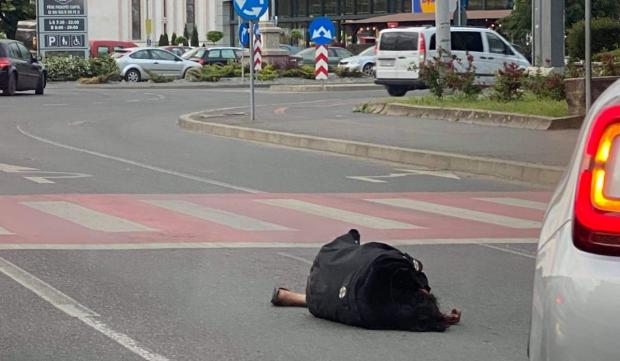 Femeia s-a prăbuşit pe stradă, printre maşini, şi nimeni nu a intervenit să o ajute. Zeci de maşini şi oameni au trecut nepăsători pe lângă ea până ce un şofer a oprit maşina lângă ea şi a sunat la numărul de urgenţă 112.