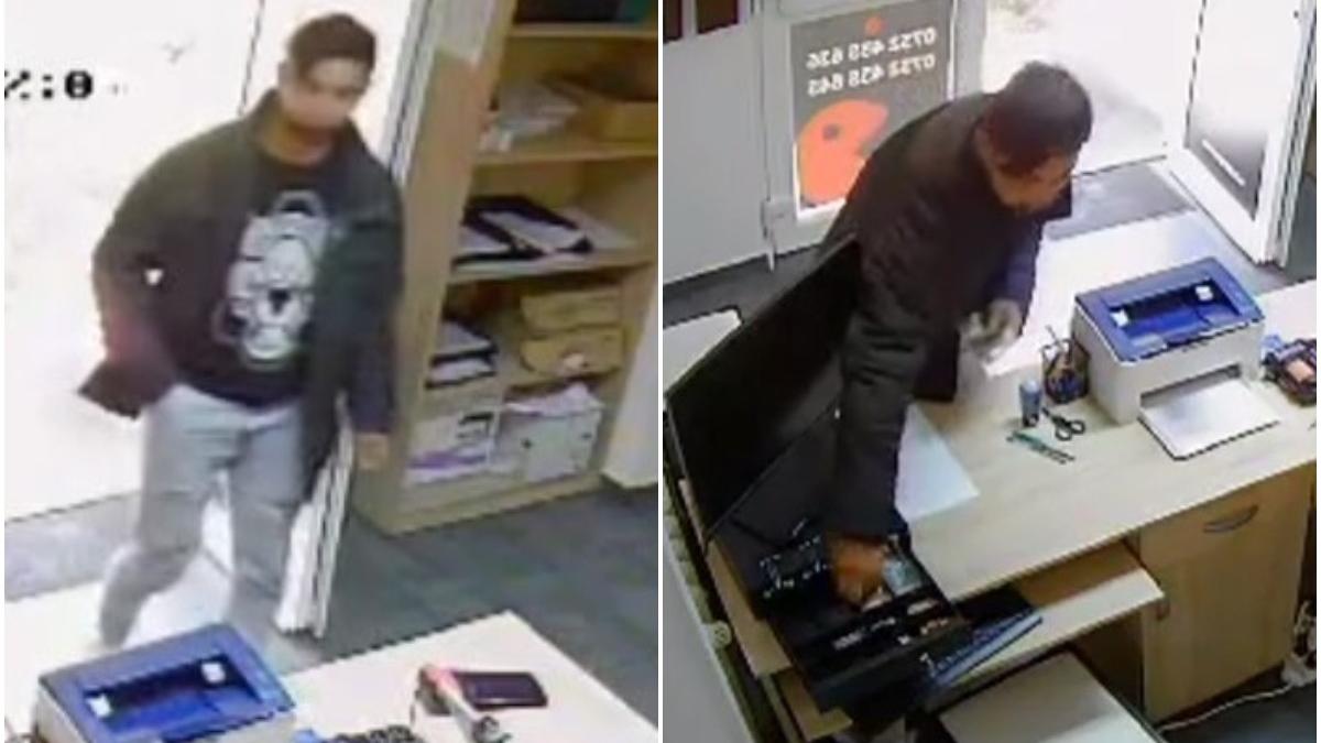 În imagini se vede cum individul intră în magazin şi profită de faptul că niciun angajat nu era prezent acolo în acel moment.