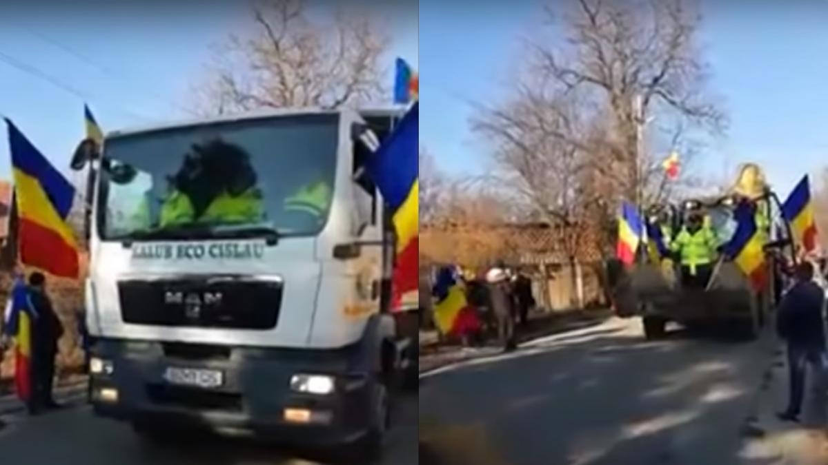 Prin faţa oamenilor au trecut şi căruţe, călăreţi şi copiii şcolii din localitate. În plus, muncitorii au fost puşi să ţină steagurile chiar în cupa excavatorului.
