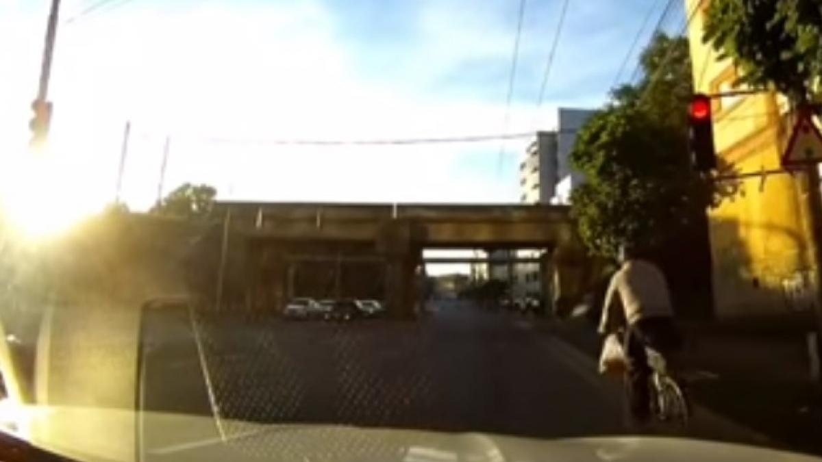 În imagini, biciclistul poate fi observat cum trece pe roșu printr-o intersecție, traversează pe trecerea de pietoni și îi taie calea unui motociclist care vroia să plece regulamentar de la semafor.
