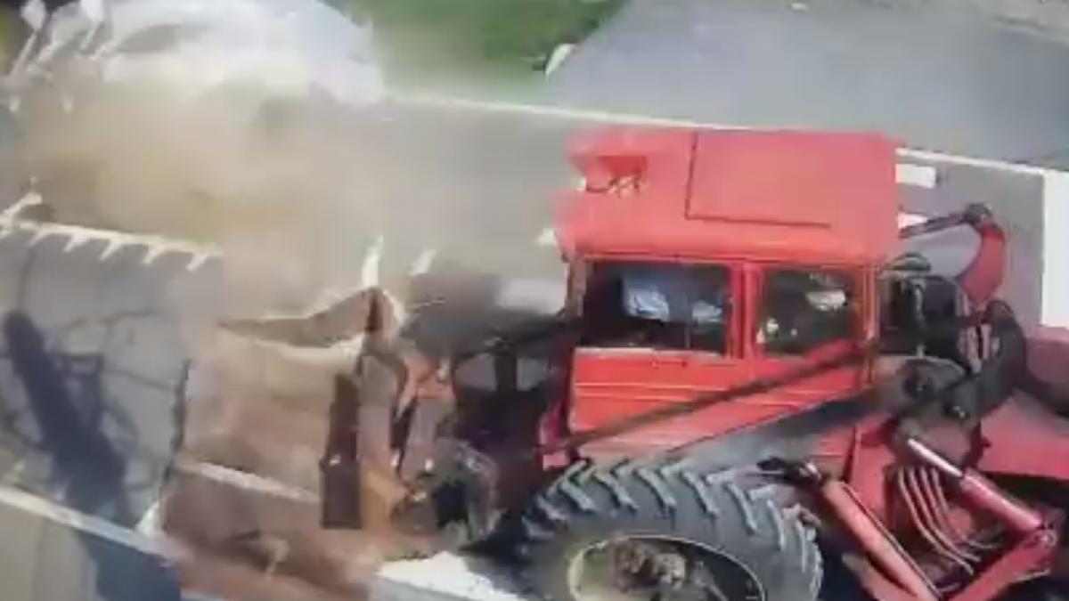 În imagini se poate observa cum un autoturism a lovit puternic un excavator, în dreptul trecerii de pietori. În urma impactului, mașina a fost proiectată zeci de metri pe șosea.
