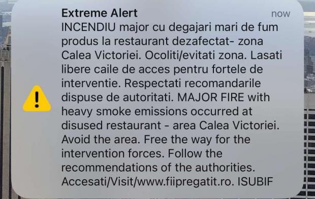 A fost remis un mesaj de informare şi avertizare a populaţiei prin sistemul RO-ALERT, informează Biroul de presă al Inspectoratului pentru Situaţii de Urgenţă Bucureşti-Ilfov (ISUBIF).
