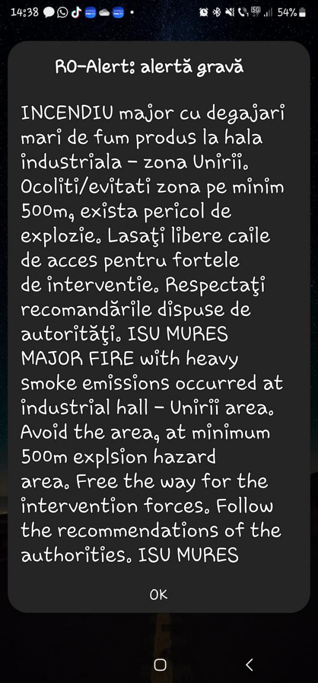 Pentru protecția populației aflată în apropierea zonei, a fost emis mesaj de avertizare prin intermediul sistemului Ro-Alert.