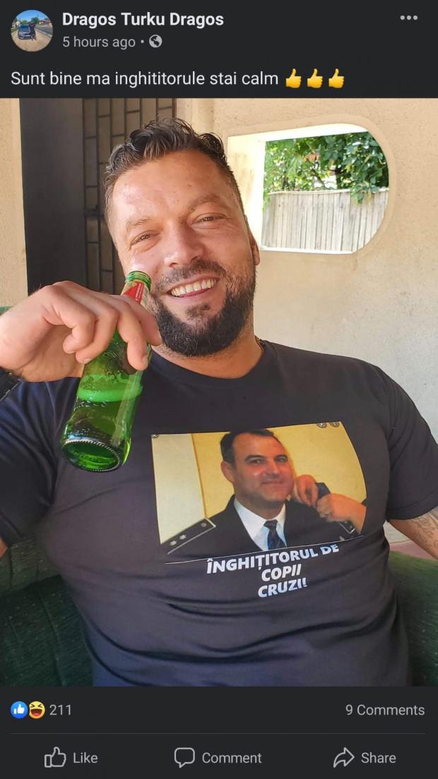 Înainte de a fi săltat de mascați, Turcu a postat o fotografie pe Facebook în care purta un tricou cu fața polițistului pe care l-a amenințat, sub care scria: ”Înghițitorul de copii cruzi”.